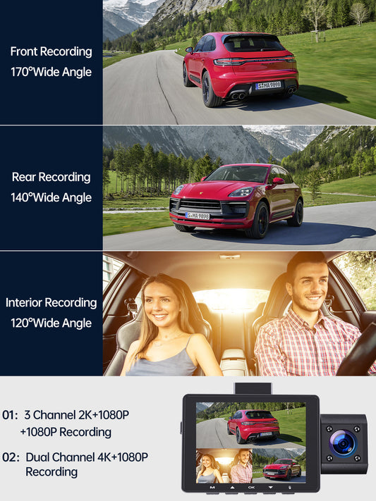 • 3 Channel 4K Dash Cam Front and Rear Inside, 4K+1080P Dash Camera Front and Inside, Triple Car Camera 2K+1080P+1080P with IR Night Vision, WDR, 170°Wide Angle, Parking Monitor